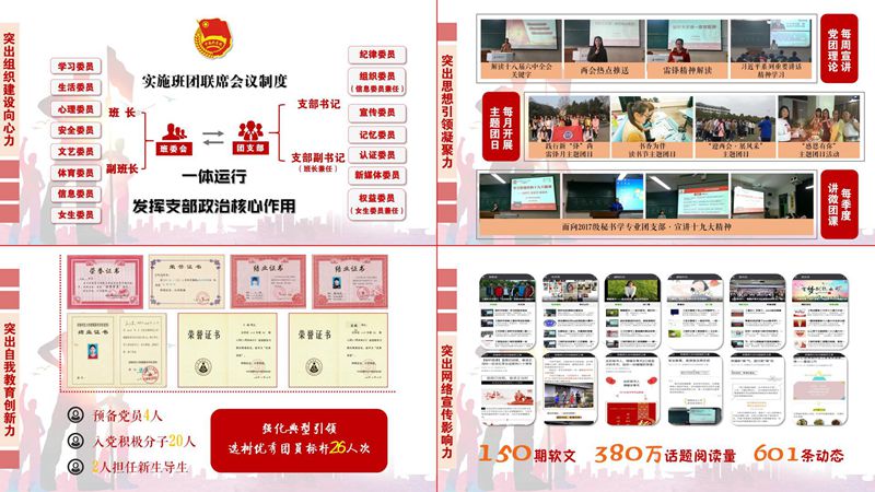继往开来,开启青春新时代。获评校级优秀团支部、团小组,所在班级2次获评先进班集体,团员个人累计获奖369项,其中国家级11项、省市级155项;考取各类技能证书177人次;担任校院学生干部260余人次。事迹先后被新华网、人民网、光明网、安徽卫视、阜阳电视台等媒体报道950余次。
