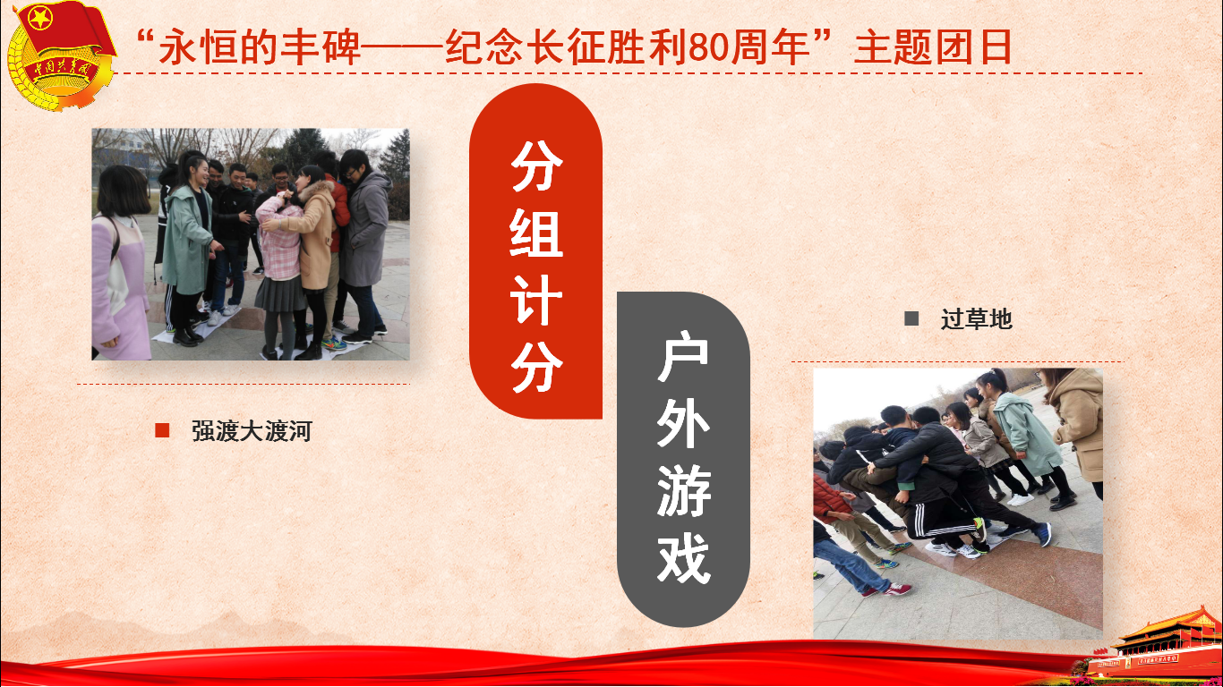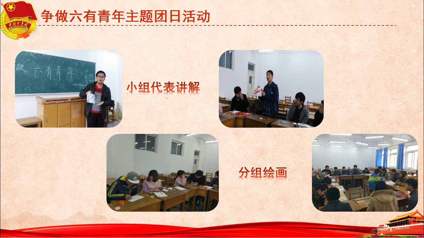 如为学习习总书记讲话响应习总书记做六有青年的号召而开展的以小组合作画宣传画诠释自己对六有青年的理解的活动,这种形式让每位同学都能切身参与进来,在活动时引发其思考,即调动了参与者的积极性又丰富了其课余生活,同时增加了班级凝聚力;为培养同学们的时代责任感和历史使命感缅怀革命先烈而召开的纪念长征胜利80周年团日活动,将长征途中感人至深的故事与户外游戏结合起来,潜移默化地帮助同学了解长征知识,又能在一定程度上让大家感同身受,同时培养了团队意识和拼搏精神……