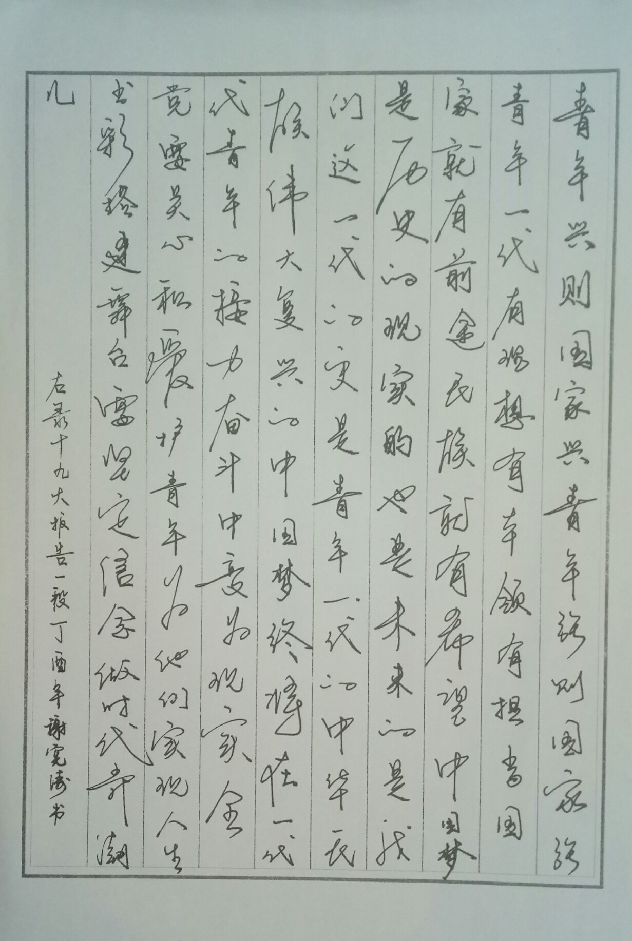 十九大报告中,习近平总书记提出的三个“意味着”让我们特别关注和极大的感触。本支部一共有46名共青团员,肩负着21世纪的历史使命,肩负着建成社会主义强国和实现中华民族伟大复兴的重任。大家虽然生活在和平年代,但通过对历史的学习,前人之鉴,都明白现在的幸福生活来之不易。我们都会坚持中国共产党的领导,不忘初心,坚定跟党走,认真学习,努力提高自己的素质和知识水平,做一个对社会有贡献的人。