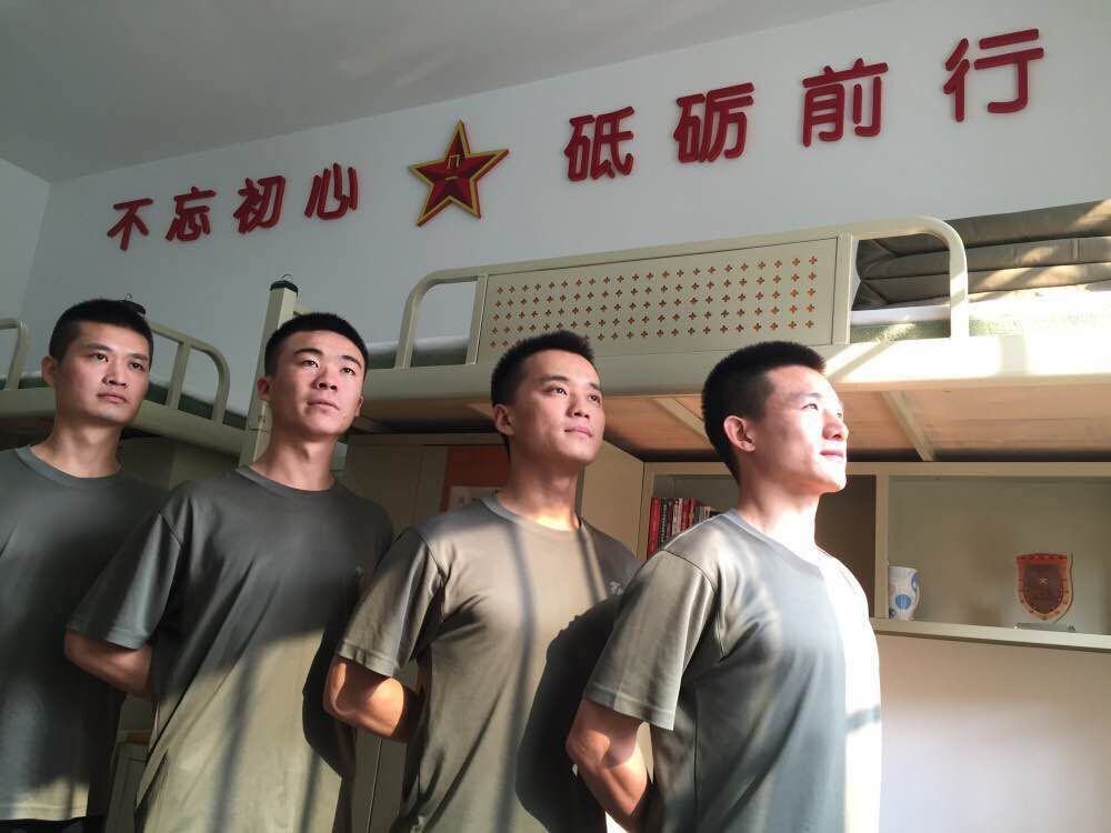 平整洁白的床单,“豆腐块”似的军被,一条线排列的脸盆、毛巾、暖壶,简洁干净的桌椅,衣柜前粘贴的军魂班成员事迹简介,“不忘初心,永葆本色”的红色标语庄严肃穆地屹立在墙壁两侧……