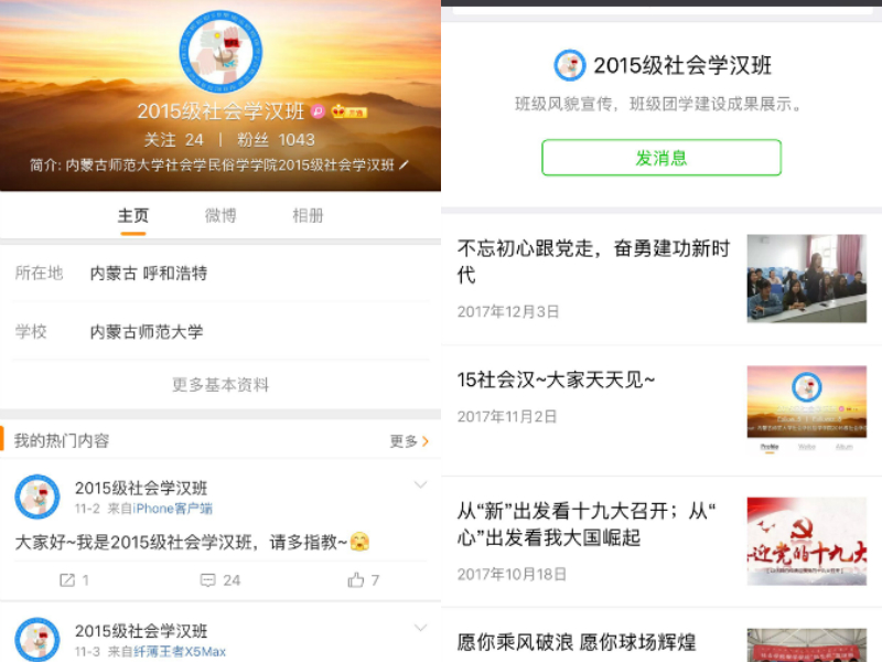 宣传是一切活动的开端,好的开端则是成功的一半,所以更新宣传形式、探索新的宣传途径,利用好新媒体的快速发展是扩大团支部影响的重要方法。2015级社会学汉班团支部从以下两方面拓展宣传形式,提升展示活力。一方面,创办团支部公众号,在团支部内部组成公众号小组,负责运营与日常维护,将团支部内部的日常团日活动、“一学一做”的开展进程以及自己专业的学科知识与团支部和支部团员所获得奖项的展示。公众号的创立是团支部对外宣传的平台,与别的支部交流合作的重要渠道,而2015级社会学汉班团支部在公众号一经创立一个月关注量就突破300人,走在全省前列。另一方面,2015级社会学汉班建立了属于自己的微博账号,比起公众号,微博的宣传形式更加活泼生动,也是团支部内部成员和其他团员学生所喜闻乐见的展示方法,及时的将共青团中央官方以及内蒙古团委、内师大团委等官方微博分享给自己的粉丝,同时也将团支部本身的活动进行宣传。而团支部微博账号也是全省首批建立的,在短短两个月时间,关注量突破1000人。2015级社会学汉班团支部将公众号与微博相结合,突破了传统宣传方式的界限,平台与手段并行利用新媒体,达到了良好的效果,提升了宣传展示的活力。