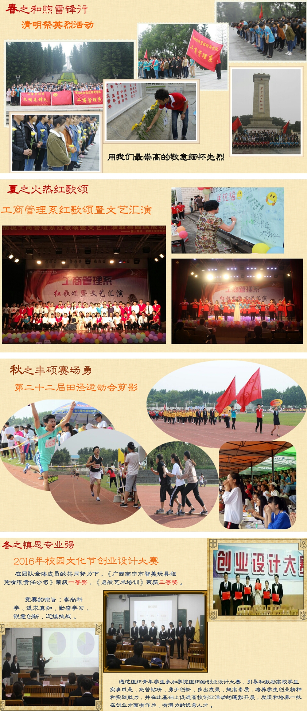 中国共青团广西经济管理干部学院工商管理系总支部委员会(以下简称工商管理系团总支)在学院团委的正确领导下,积极配合开展各项团政工作,加强落实共青团员的思想建设,重视组织建设和制度建设,在日常生活中积极开展爱国主义、集体主义、社会主义教育;深入开展社会主义精神文明创建活动;为青年学生搭建学习交流活动平台,创造更多的空间和更好的条件,为学生提升综合素质的全方位服务。