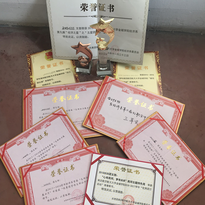 20150535支部,是一个正在前进的支部。用思想、组织、学风,文化建设出属于自己的精彩,在活动中,勇于探索,敢为人先;在比赛中,团结一致,携手并进,在短短的一年中荣获:南航金城学院“周恩来、邓颖超”提名班;南航金城学院“标兵班级”荣誉称号;南航金城学院“先进班级”荣誉称号;南航金城学院“五四红旗团支部”荣誉称号;南航金城学院“五四最佳团日活动”荣誉称号;南航金城学院“五四优秀团日活动”荣誉称号;经济之星之“五星团支部”;经济系“活力示范团支部”荣誉称号;经济系“魅力示范团支部”荣誉称号;经济系支部活力展示月“优秀团学进支部公开课”荣誉称号;经济系支部活力展示月“优秀团日活动”荣誉称号;经济系第八届支部风采大赛三等奖; 经济系学风建设月“优秀学风班级”荣誉称号;组建“红色万里行”团队获得“院级优秀团队”荣誉称号, 组建“指尖上的党团”团队获得“系级标兵团队”荣誉称号,组建“纸上传承”团队获得“系级标兵团队”荣誉称号;经济系第六届红歌会三等奖。