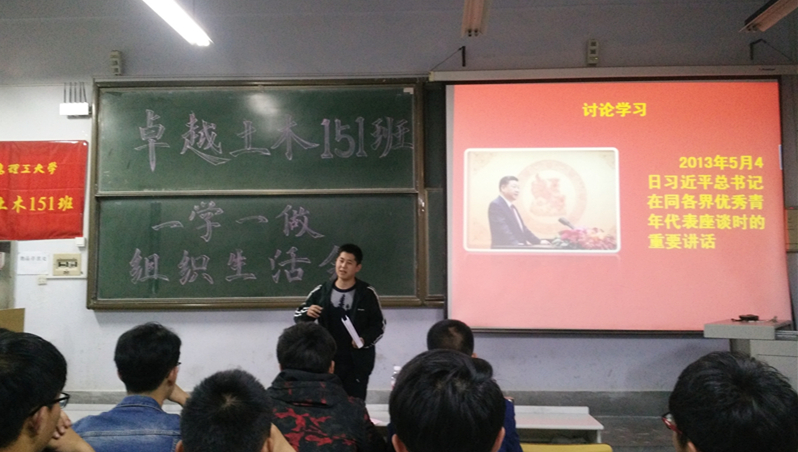 团支部思想文化建设是发挥班风旗帜作用的主要内容。支部积极组织成员参加学习总书记讲话,做合格共青团员教育实践活动,深入社区开展社会主义核心价值观、中国梦等主题教育活动,积极开展志愿服务,学雷锋常态化。十九大期间,团支部结合实际,组织学习十九大精神,践行社会主义核心价值观,积极参加土木学院青马培训3次,并定期组织开展集体学习两会精神、“不忘初心,筑梦青春”学习十九大等主题团日活动10余次。