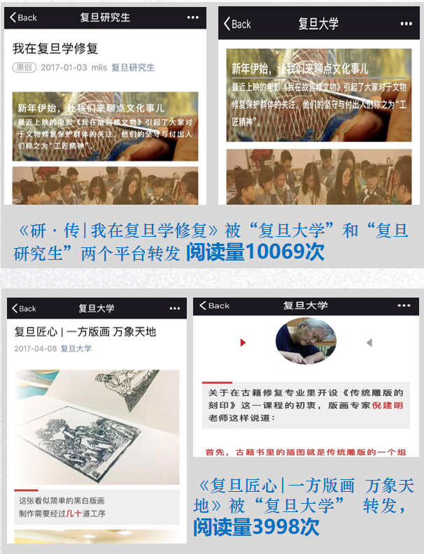 以新媒体平台为阵地,传播“工匠”之声 综合运用“复旦mlis”和“古籍保护学社”两个微信公众号,发挥各自特点,形成宣传合力。设置运营小组和审核机制,鼓励理性发声。截至目前,两个微信公众号共吸引关注量800余人次,发推送82篇,阅读总量达30000余次,其中2篇被校级以上媒体平台转发,阅读总量14000余次。