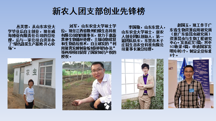 一群壮志凌云、胸怀创业梦想的青春少年,于2012年7月组建新农人创业团队团支部,秉承“登高必自”的校训,创新性的构建了四色农业生态循环模式,以垃圾的“三元二级分类”为基础,以环境昆虫过腹转化处理有机废弃物为核心,实现三全利用,并以天敌昆虫为导向,打造生态植保。团支部注重实践创新,培养了百名优秀团员,“蚯蚓王”—刘军,“黄粉虫王”—丛芙蓉等创业先锋多次获得央视宣传及新闻报道。现团支部成员获国家级荣誉8项,省级荣誉10余项,校级荣誉多项。2017年,团支部在暑期“三下乡”社会实践中又获国家级立项及优秀实践团队表彰。