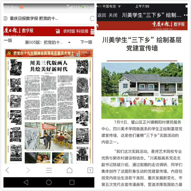 支部书记带领全体团员认真开展活动,善于利于各类新媒体平台宣传展示本支部特色活动。支部活动——走进党员教师工作室被《四川美术学院官网》报道。支部成员参与的2017年大学生暑假三下乡社会实践活动被《重庆日报》头版报道。同时,重庆共青团——学载青春梦微信公众平台进行了专题报道。支部成员参与的学习十九大精神主题创作被《重庆日报》整版报道,同时中国青年网、凤凰资讯、华龙网、腾讯网等各大网络媒体都进行了转载和报道。