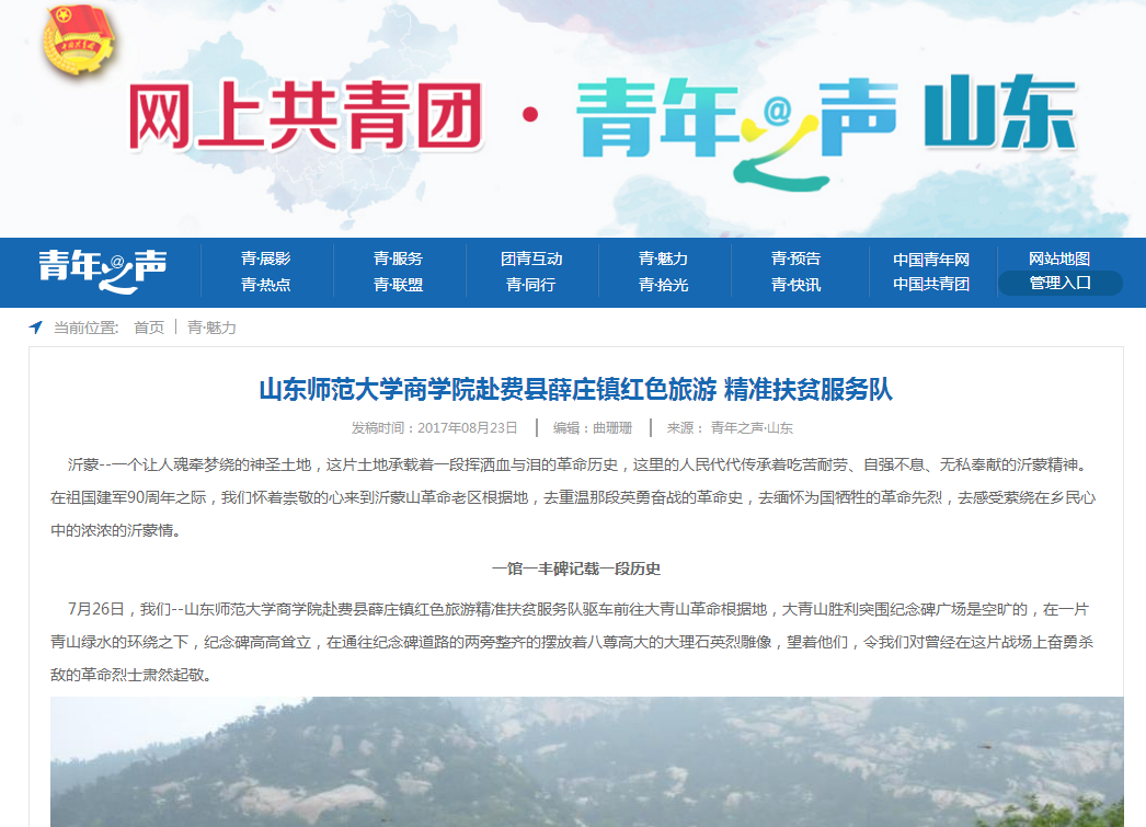 纸上得来终觉浅,绝知此事要躬行。该支部于2017年7月,由团支部书记王钇霏带领支部成员组建山师大商学院精准扶贫服务队赴革命老区费县调研,调研成果被共青团中央、中国青年网等多家媒体转发报道,荣获全校唯一一支“国家重点服务队”荣誉称号。