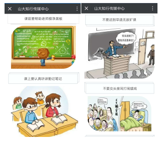 传统宣传与新媒体宣传相结合,线上与线下齐头并进,对我团支部举办的各项活动进行全面的宣传报道。充分利用“青年之声”解决同学所惑,利用“山大知行传媒中心”“山大15工管团支部”微信平台、新浪微博,努力开辟“活力”生动局面。其中我支部响应课堂纪律“四要四不要”向平台投稿原创漫画微信一篇,受到全校好评。