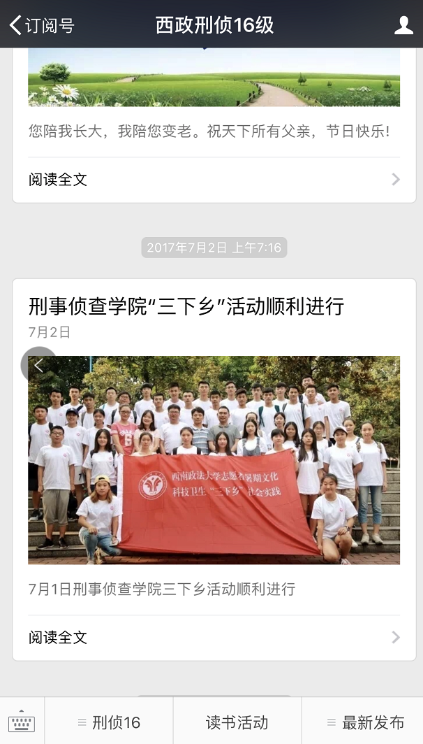 刑事侦查学院2016级团总支积极利用现代化网络宣传方式。在我校率先建立了年级微信公众号,自建立以来共发表推文136篇,在一定范围内传播了“支部”声音,树立了“支部”形象;在我校率先建立了微信家长群,目前各群总人数达到518人次,畅通了家校沟通联系渠道;在学院官网上共发表10篇文章;2017年暑假三下乡实践活动被《重庆商报》、《新浪财经》等多家主流媒体宣传报道。2017年新年制作的“刑侦五福”被重庆市地方自媒体推广,在新浪微博造成了一定的影响。在知乎上策划的《在西南政法大学刑侦学院就读是一种怎样的体验?》浏览量已突破了两万,给学院带来了正面积极的舆论影响。
