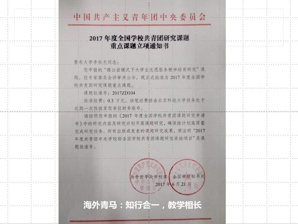 团总支将海外团支部建设融入课题项目,获得团中央重点项目立项1个,获教育部“两学一做”学习教育优秀案例1项,获新华网、大众网、山东省教育厅报道6次。