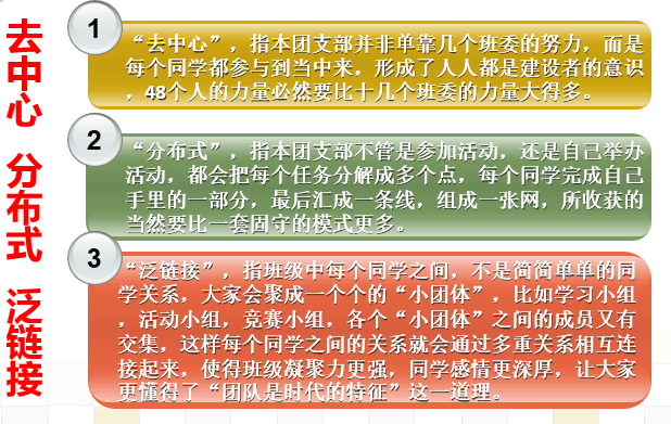一个优秀的团支部,必然有它独特的氛围,才能保证它能更好的发展。本团支部的氛围建设,主要分为三点:去中心,分布式,泛链接。