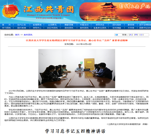 一、统一思想,凝聚支部共识。团支部坚持以习近平新时代中国特色社会主义思想为指导,坚持以思想引领为核心、服务同学为根本,组织成立学“习”小组,开展了学习习近平总书记“五四”重要讲话精神交流会、观看党的十九大开幕式并进行学习交流等活动,还与方志敏烈士陵园教育基地建立了稳定的联系。