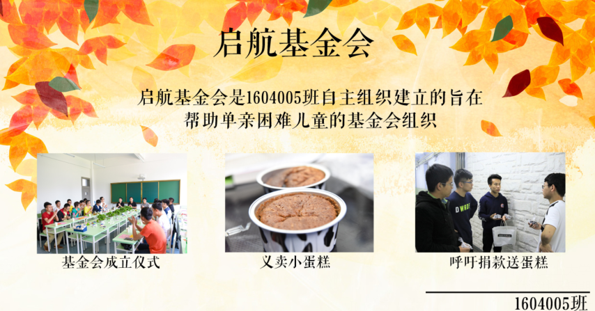 1604005团支部自主成立“启航基金会”。支部团员们发挥集体智慧,利用爱心义卖等各种活动筹集善款,完成了第多期资助活动,为单亲困难儿童送去了关怀与爱心。1604005团支部正在用自己的实际行动影响更多支部和广大团员,投身志愿服务活动,引导共青团员树立爱心志愿新风尚。