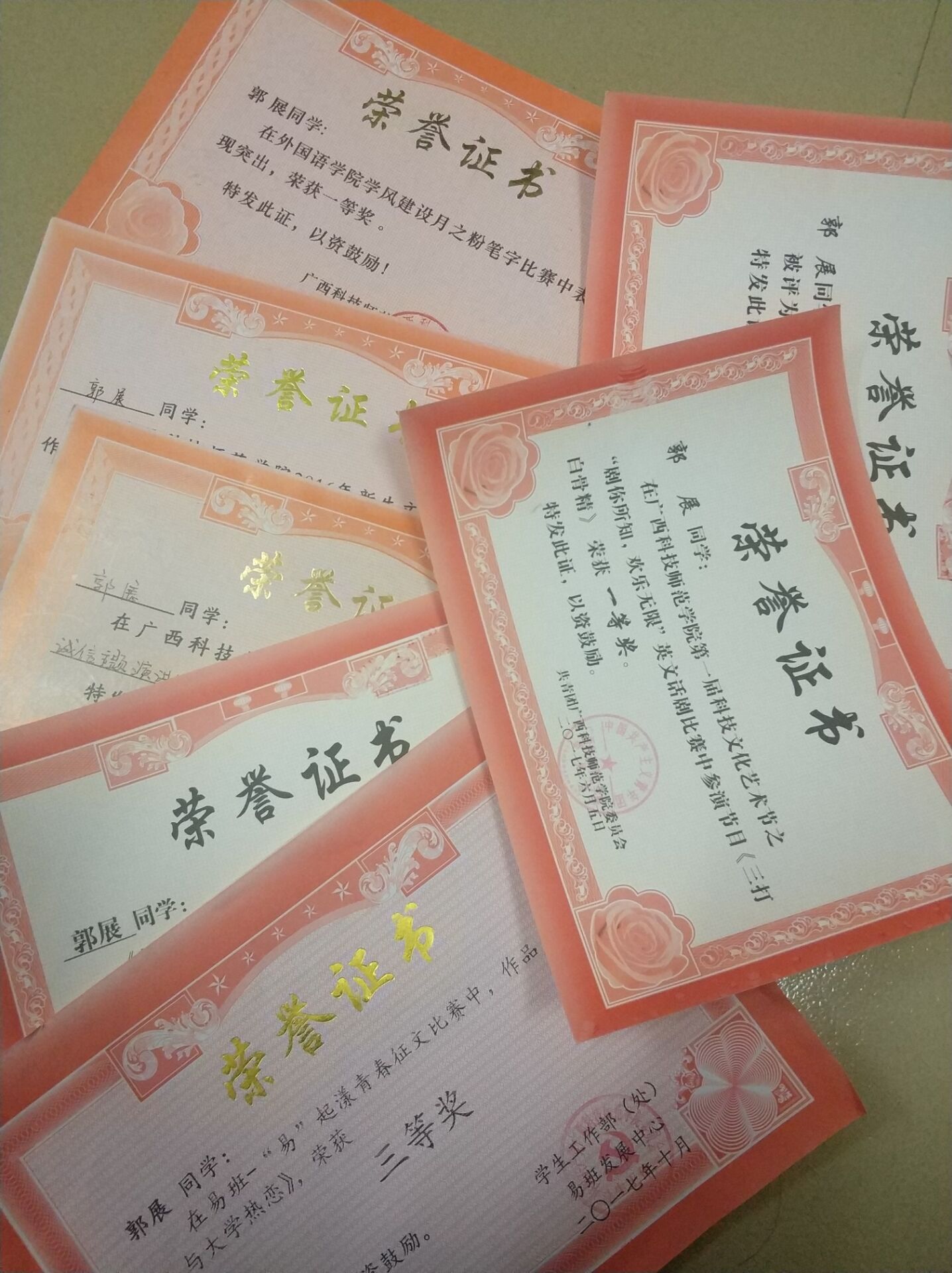 同时在文体方面,我们也不甘落后。2017年6月我支部同学参加我校“广西科技师范学院第一届科技文化艺术节之“剧你所知,欢乐无限”英文话剧比赛”中荣获第一名;2017年6月赵诗贤同学参加我校“首届乒乓球比赛 普通专业组女子单打”获第四名;黄国相同学在我校“第三届田径运动会普通专业男子组100米”决赛中荣获第三名等等各种奖项。