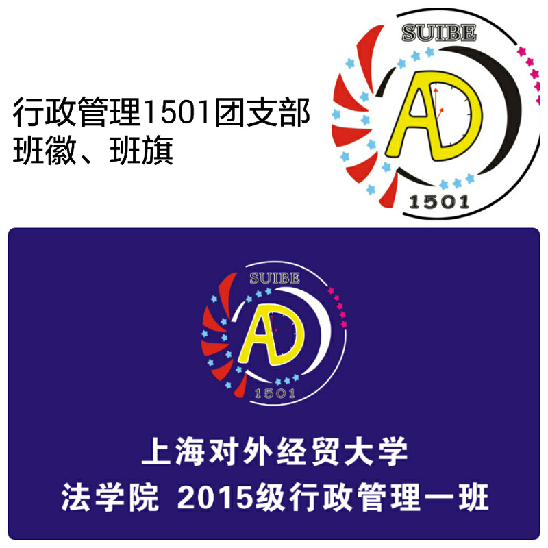 班徽:字母"AD"是“行政管理”专业的缩写,字母"D"内的时钟刻度和指向“一时”的指针则代表珍惜时间和“一班”,19颗星星则代表着班级里的19位同学,红色的光芒象征着行管1501班团结一心一定能散发光芒。