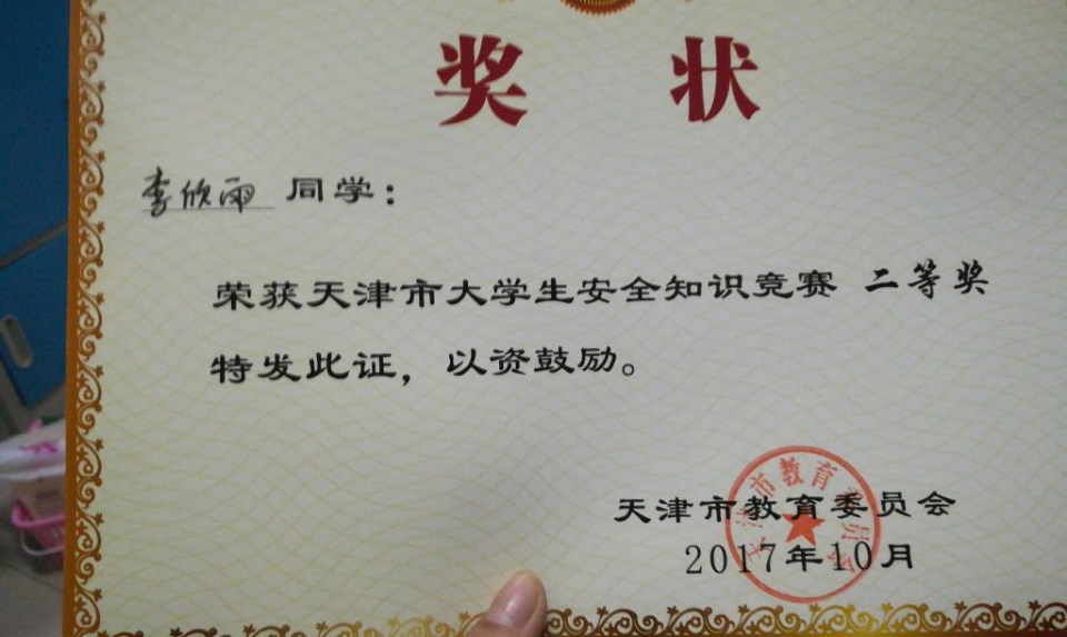 我支部成员李欣雨在2017年天津市大学生安全知识竞赛中获得二等奖