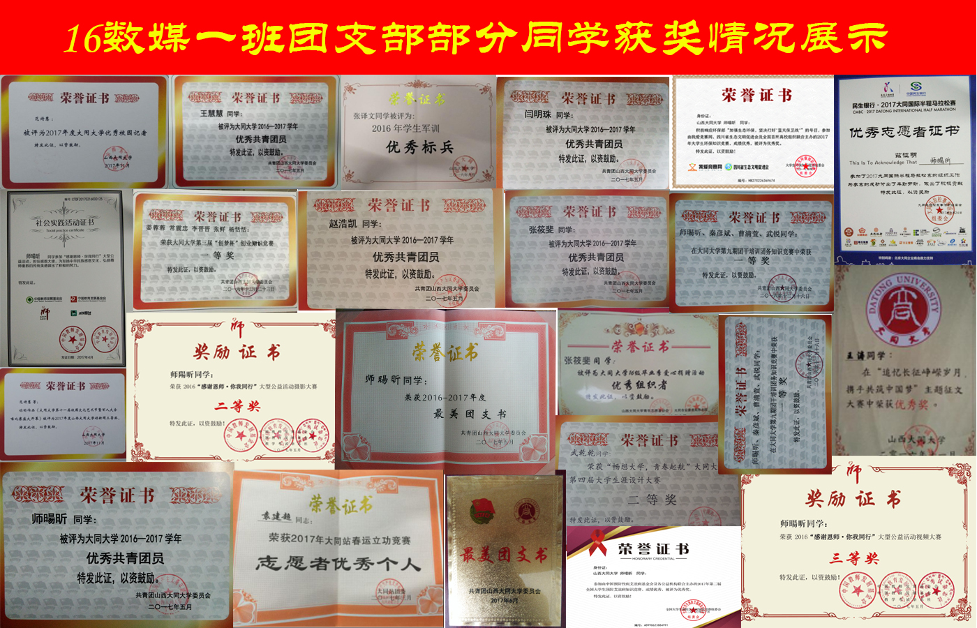 2016年9月,来自山西各地的39名同学齐聚大同大学,在这片美丽的土地上,组成了一个充满激情、团结向上的支部——16数媒一班团支部,带着对大学的憧憬、带着家人的期盼、带着社会赋予我们的责任,开始了我们大学的求学探索之旅。支部现有成员39人,其中38名团员,10名入党积极分子,3名重培对象。“踏实做人、吃苦耐劳”是我们的精神品质,“追求卓越、勇于创新”是我们的奋斗目标。