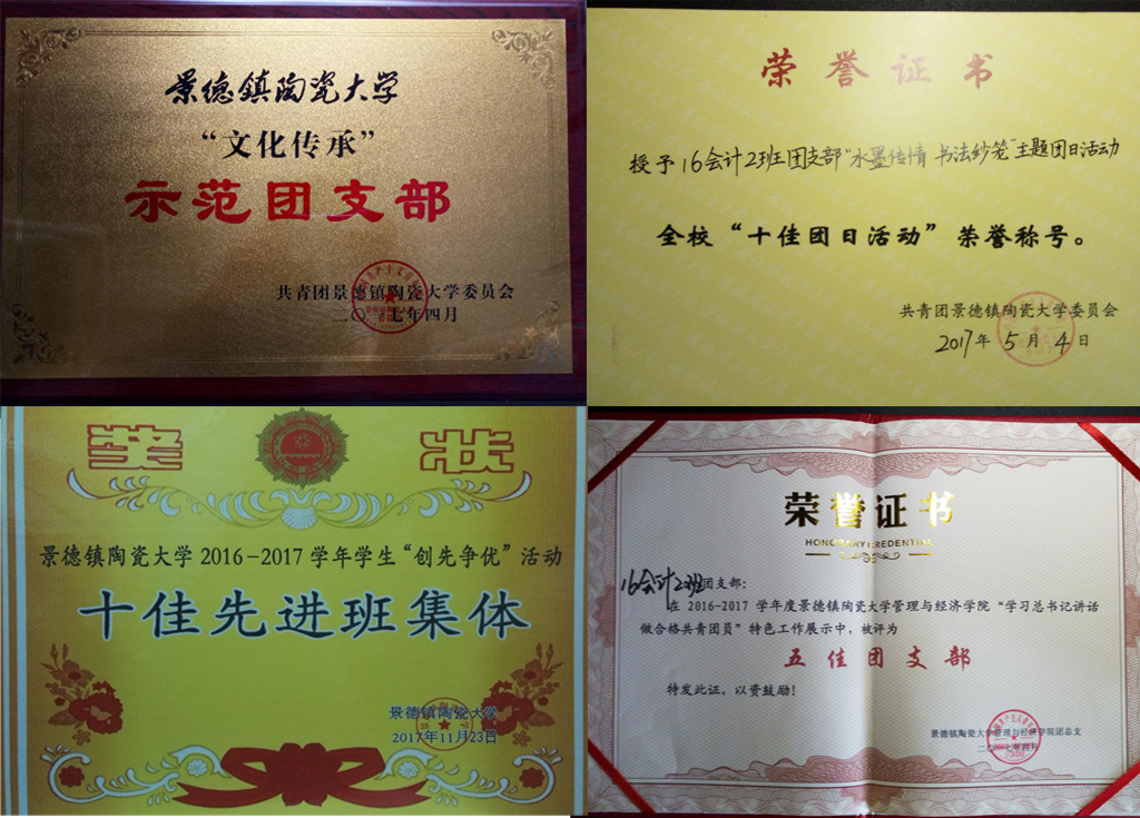 2017年4月,获景德镇陶瓷大学管理与经济学院“五佳团支部”荣誉称号等。