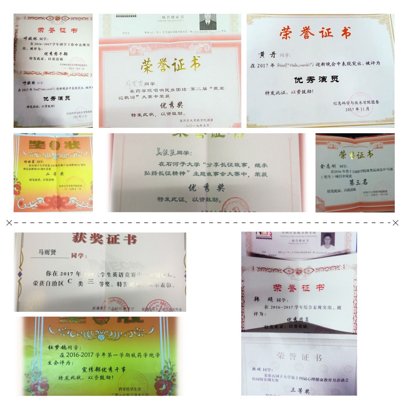 2016-2017学年中全班挂科率仅为1.3%,位列年级第一(2016年级),四级过级率56.8%,专业排名前十占3位,专业排名前五十占18位(占支部人数约50%)。国家励志奖学金3人,校级奖学金8人。17年被药学院团委评为“优秀文明集体”!同时涌现出一批表现突出的先进个人,多位同学获得羽毛球国家二级裁判认证,自治区英语竞赛斩获荣誉,等等。