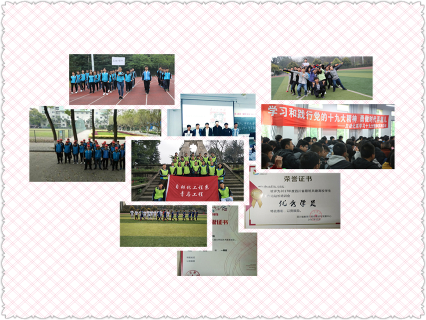 支部全体成员积极参加院系组织的“学习党的十九大精神”主题思想教育活动,努力提高思想政治素质;尤其在十九大闭幕后,大家积极投身“《习近平的七年知青岁月》读后感”、“我心中的习近平”、“勇做时代弄潮儿”等10余项团日活动;同时我团支部积极开展各种素质拓展活动和志愿服务活动,曾获四川省易班建设优秀学员、四川省第八届大学生艺术展演活动第一名2项、校级校园文化艺术节校园团队及个人第一名5项、社区优秀志愿者等荣誉,培养了团员们的综合实践能力,使团员们真正达到德、智、体、美、劳全面发展的要求。