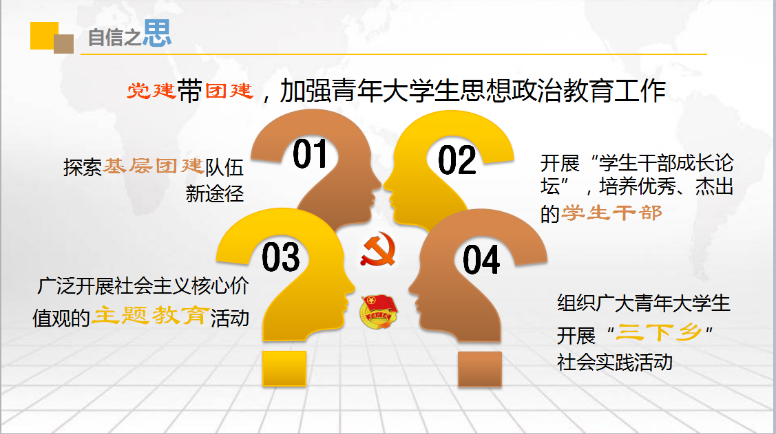 团总支致力于构建“凝聚青年、服务大局、当好桥梁、从严治团”的四维工作格局,深深植根于青年,成为联系服务青年的坚强堡垒。