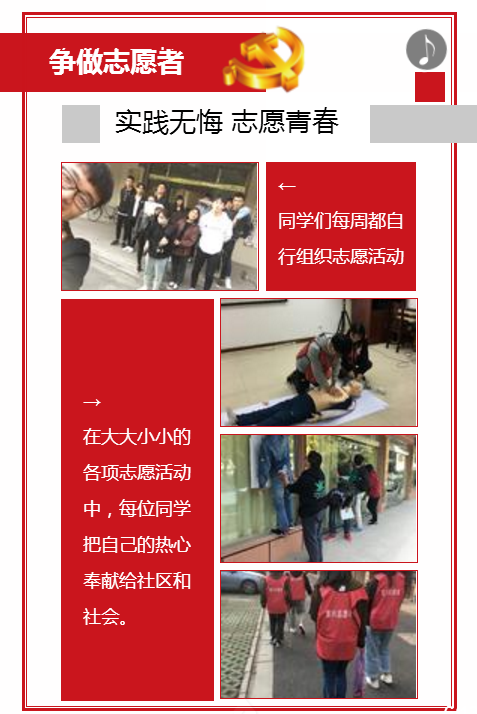 在过去的一年中,我们自发组织或者积极参加了许多活动,例如每个月都会举行一次文化活动和体育活动用来丰富课余生活,通过各种各样的形式,使得每个人都能参与其中,收获团体合作的乐趣。我们在过去的军训中获得了先进排,在运动会中获得了优秀团体奖等,此外,我们每周都组织同学去到社区,广场等地进行志愿服务,也因此获得了志愿服务优秀集体的奖项。这些荣誉离不开每一位同学的努力和付出,相信我们的这只队伍将会披荆斩棘,创造更好的成绩!