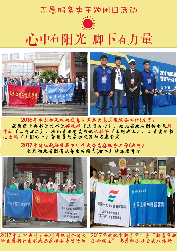 自“活力提升”工程开展以来,我们坚持面向青年,服务青年。所参加和开展的志愿服务活动如2017年国际航联世界飞行者大会志愿服务工作、2017年团中央村土地利用规划全国大学生暑期社会实践志愿服务专项行动、2017年武汉市新青年下乡“新青年服务新临空”志愿服务社会实践活动、2016年卓尔杯足球挑战赛全国总决赛志愿服务工作等也曾受到团中央书记处书记傅振邦、湖北省副省长郭生练、湖北省团省委书记张桂华、副书记金鹏等领导同志的高度肯定。