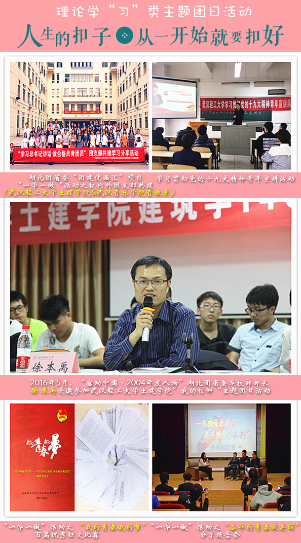 我支部坚持思想引领核心任务,秉承着“加强团的基层组织建设,为团员青年成长服务”的理念,通过“学习十九大 共筑中国梦”、“学习总书记讲话 做合格共青团员”等教育实践活动,积极开展各类社会主义核心价值观主题宣传教育活动为载体来凝聚青年,引导团员青年树立正确的世界观、人生观、价值观,提升组织活力;2004年“感动中国”人物、湖北团省委学校部部长徐本禹曾全程参加土建分团委学生会所举办“我的信仰”主题团日活动,并得到了人民网、中国青年网、青春武汉、湖北日报等媒体的宣传报道