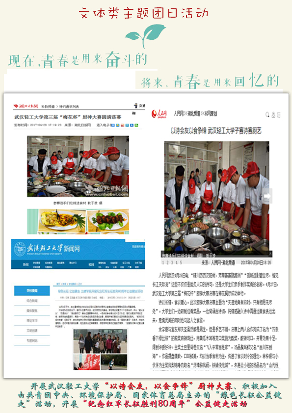 在校园文化培育、创新创业创优、社会实践与志愿服务等方面开展工作,依托通过开展“厨神大赛”、“纪念红军长征胜利80周年”徒步健走活动等等形式多样的学生活动提升团员参与活力。