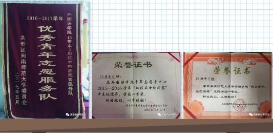 本支部还鼓励成员积极参加社会实践。自团支部“红木棉”志愿者服务队成立以来,支部成员积极投身于漳州市花博会、海外华侨寻根之旅、“探老村之美,寻革命之火”暑期社会实践等多种多样的志愿者活动,并荣获漳州市优秀青年志愿者、校级暑期社会实践积极分子等奖项。截至目前,成员累计参加志愿活动达到600余次,团支部服务总时数达到2326.5小时,人均服务时数达到72.7小时,在外国语学院15级团支部中排名第一。本支部服务队在2017年5月被评为校级优秀志愿者服务队。