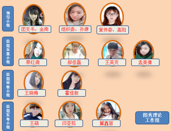 设置图秀理论工作组。包括以团支书、组织委、宣传委组成的领导小组,分别负责管理信息采集组、信息发布组、信息审核组。