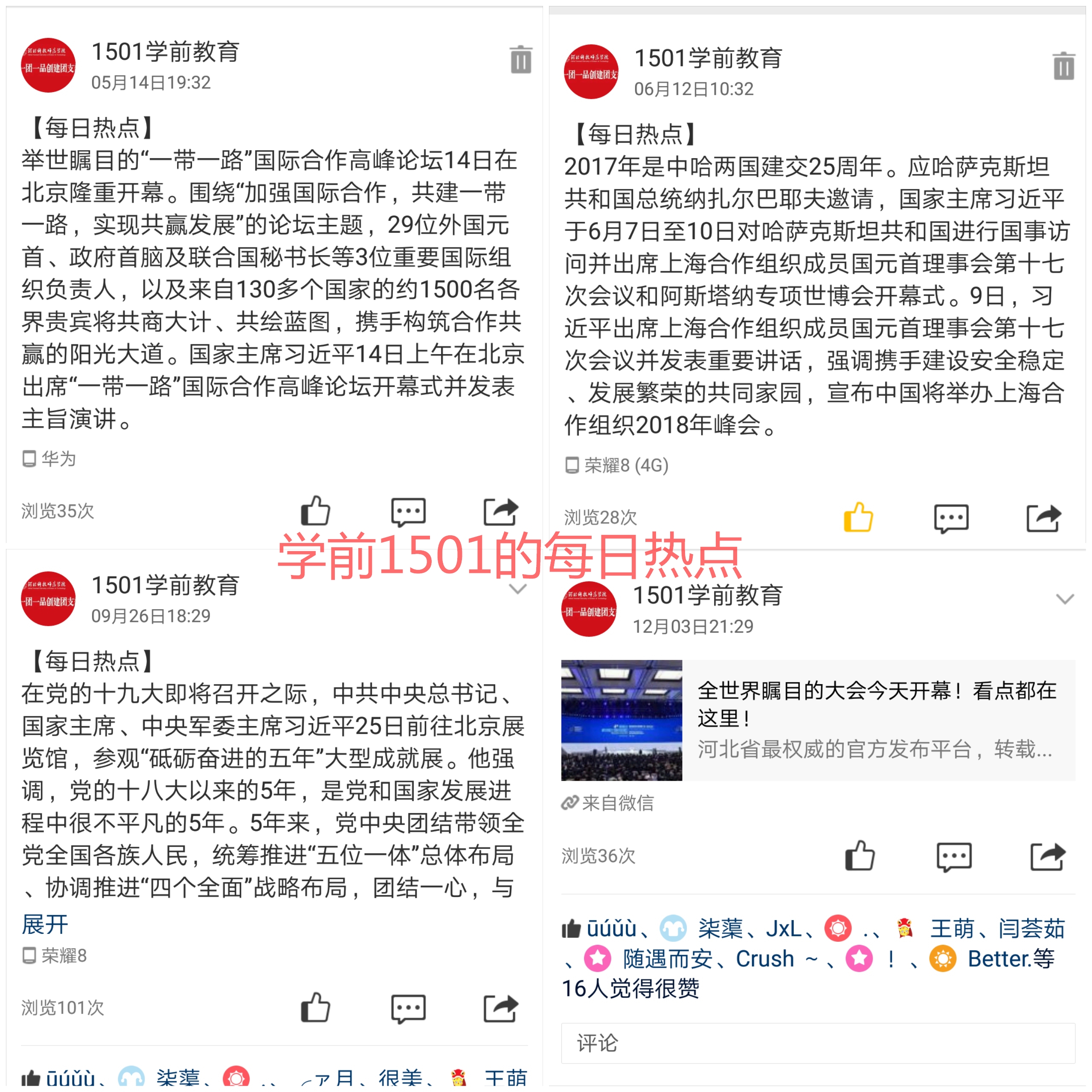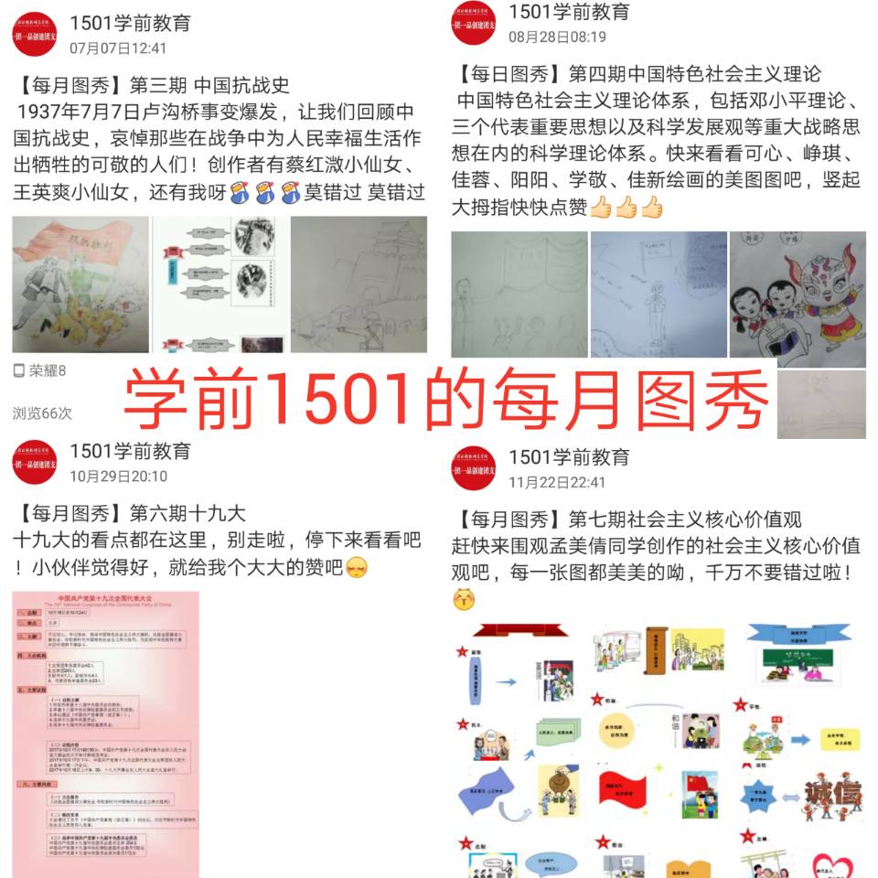 支部成员每月用图画的方式展示一项政治理论、政策法规等内容,从2017年5月至18年2月共计十期。主题为马克思基本原理概论、科学发展观、中国特色社会主义理论、社会主义核心价值观、中国抗战史、国际局势、中共十九大。