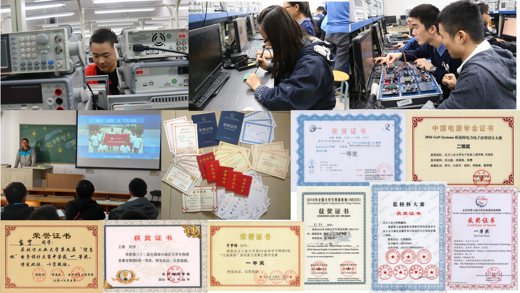 实践创新,是我们青春梦想的练兵场。我们强调创新实践能力培养,坚毅奋进,自强不息。支部累计参加国家级省部级市等竞赛数百人次,在全国大学生英语、物理、数学等学科竞赛,以及全国大学生电子设计竞赛,全国高校电力电子应用设计大赛,韩国电子设计竞赛,北京市电子设计竞赛,蓝桥杯,大唐杯,挑战杯,信息杯等专业竞赛中获省部级以上奖项100余人次。目前,支部共有3支创新创业团队,获多项大学生创新创业成果奖。支部同学积极参加暑期社会实践,有两支团队获北京市大中专学生暑期社会实践优秀成果奖。数不清的奖杯、奖状,是我们用青春写下的激扬旋律。