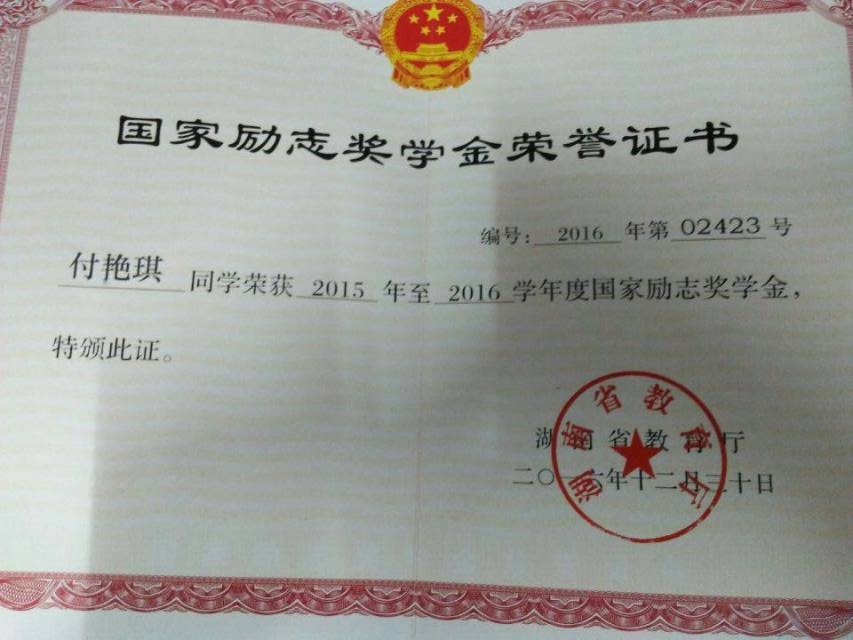 付艳琪获“国家励志奖学金”