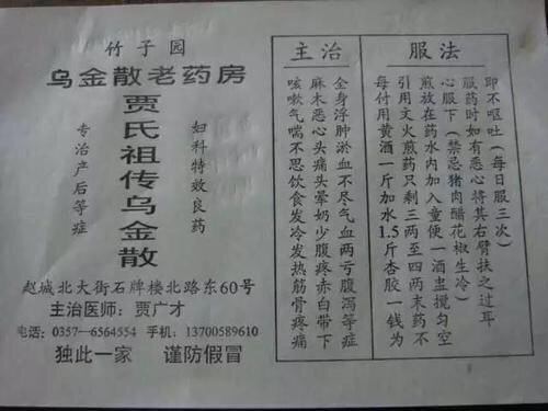作为洪洞赵城人,在很小的时候我就知道了祖传已久的乌金散,妈妈在生我后月子时就出现了怕风怕凉,不思饮食,腰膝酸软等症状。喝了三付乌金散补药后,这些症状烟消云散,真的是管用啊。这天,我来到乌金散赵城老店,和贾医生进行了沟通,让他了解到活动的内容与形式,贾大夫也是很高兴,耐心的和我讲解乌金散的广泛疗效,这样我对中医的认识有上升了一个平台。