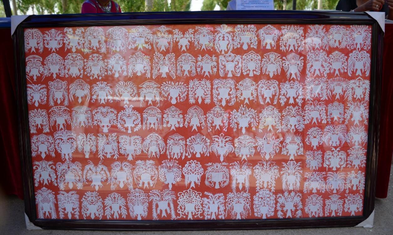拍摄于一年一度的达斡尔民族节日——斡包节。斡包节上,达斡尔民间艺人会带作品来展示,并现场制作。这位阿姨正在制作“哈尼卡”剪纸。东南大学逐鹰北疆团队在斗鱼平台上对其进行了现场直播,阿姨在一千多网友的见证下完成了制作。