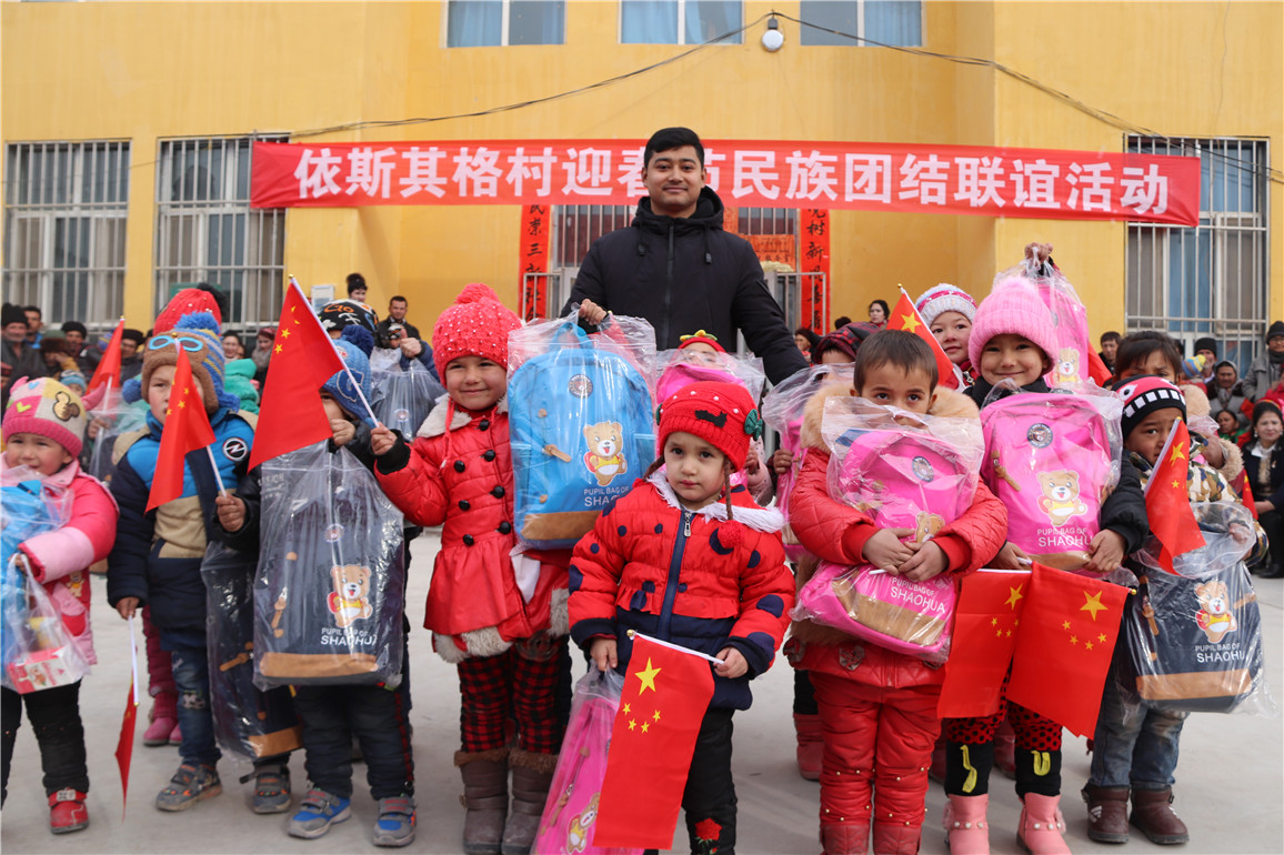 (少数民族志愿者部部长帕尔哈提·买买提跟贫困孩子们在一起过春节)
