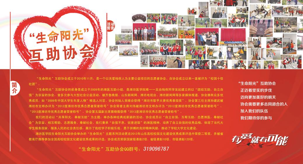 “生命阳光”互助协会成立于2009年9月,它前身为潍医互助小组,是我市唯一由残疾学生组成并为残疾学生服务的学生团体,以关爱残疾人为主要目的。自成立以来一直被评为“校园十佳社团”。曾多次参与大型社会公益活动. 我们的活动以“共享阳光,奉献互助”为主题,成员以“自立自强,互帮互助,志愿潍医,奉献社会”为宗旨,相互帮助,志愿服务,奉献社会。并持续开展特色活动,如:敬老院关爱老人志愿爱心活动、关照残疾人、火车站爱心志愿者活动、潍坊市志愿服务活动。