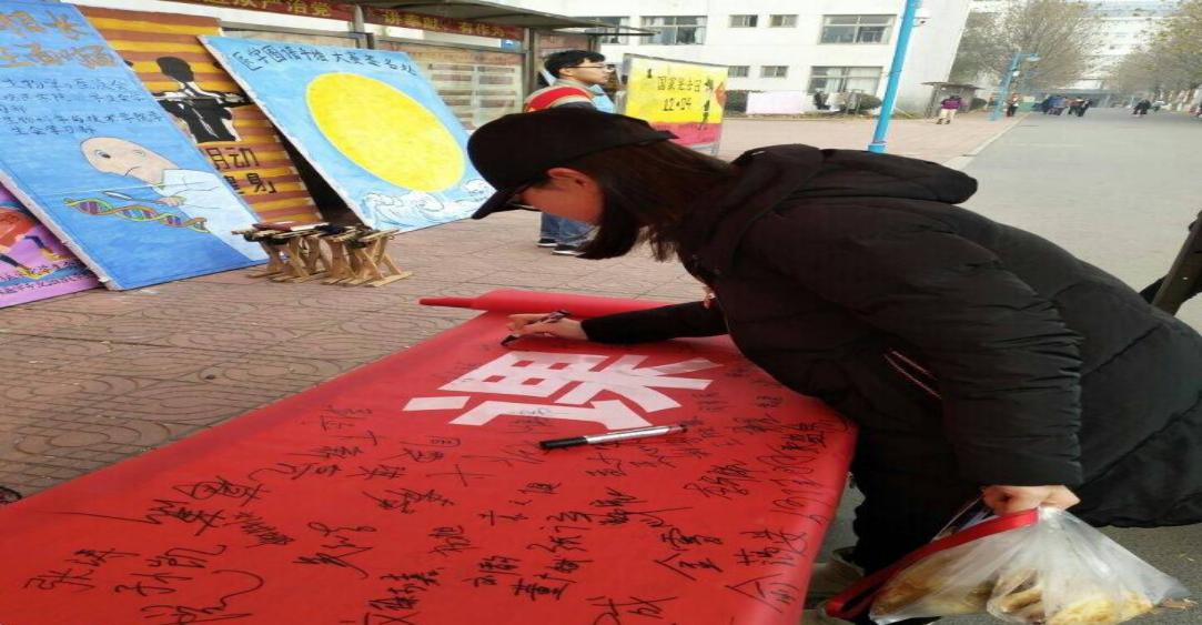 三、废除课桌文化签名活动于大学生服务中心门口举行,在门口设有宣传板和签字幅,同学们互相宣传、踊跃签名,并下定决心改掉乱写乱画的陋习。