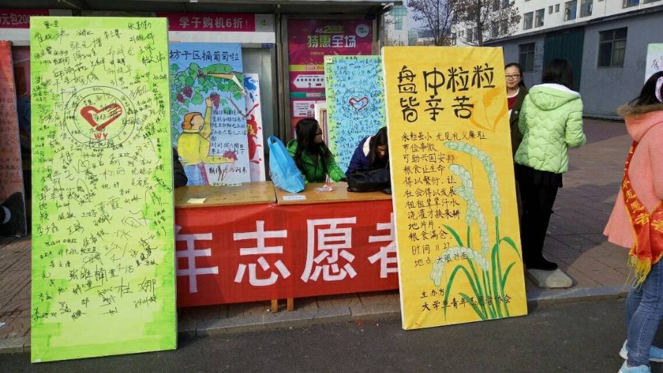 六、“节约粮食签名活动”于大学生服务中心对面举办,活动期间,在显眼位置设好宣传板和签名横幅,同学们互相宣传,并积极的签名,通过宣传和知识的普及也懂得了粮食的来之不易,并下定决心珍惜粮食。