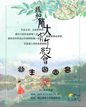 “新生游校园”等富有特色的活动,为浙师大社团建设增添了一抹亮色;同时开设校级“学分制班”,从专业化的角度不断增强同学们的旅游创新能力。