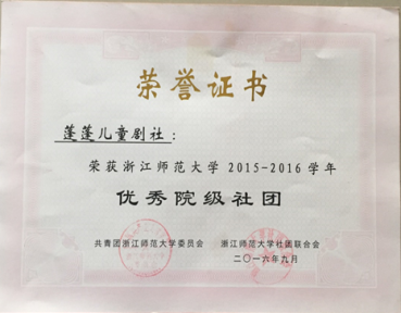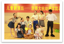 除此之外,本社开设的学分制课程,邀请多名专业老师予以理论与实践指导,蓬蓬儿童剧社也因此成为一个重要的师生合作、创造与成长的共同体。 小到在学生寝室楼设置绘本儿童剧欣赏区,大到暑期儿童剧进社区活动,本社营造了浓厚生动的儿童剧文化氛围,最为可贵的是,这种氛围已经上升为一种文化传统并成为浙师校园文化的重要组成部分。本社因此成为一个重要的师生合作、创造与成长的共同体。