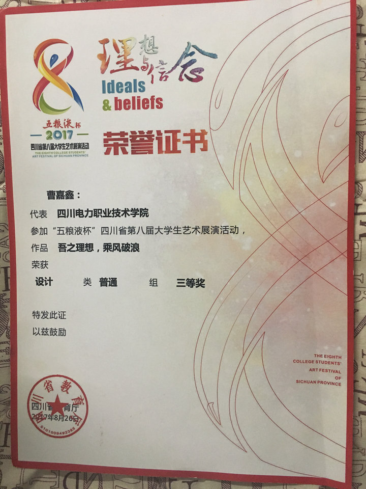 2017年5月,社团成员选送作品参加四川省教育厅主办的四川省第八届大学生艺术展演活动,摄影作品《思念》、《青春,永不落幕》和艺术作品《吾之理想,乘风破浪》分别荣获普通组三等奖;