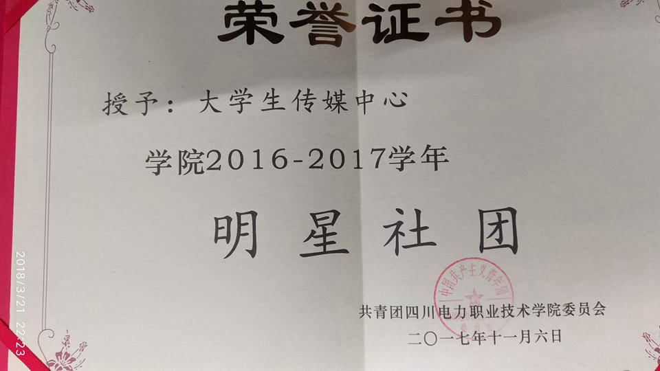 2017年11月,荣获四川电力职业技术学院2016-2017学年“明星社团”称号。