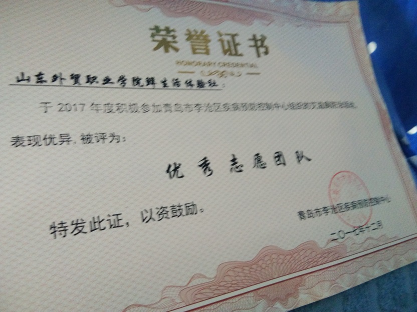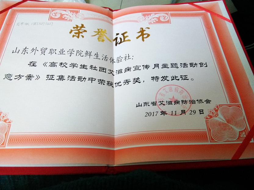 《高校学生社团艾滋病宣传月主题活动创意方案》征集活动中荣获优秀奖,”爱心陪伴大型公益活动“优秀奖,青岛市李沧区疾病预防控制中心组织的艾滋病防治活动获得优秀志愿团队奖。