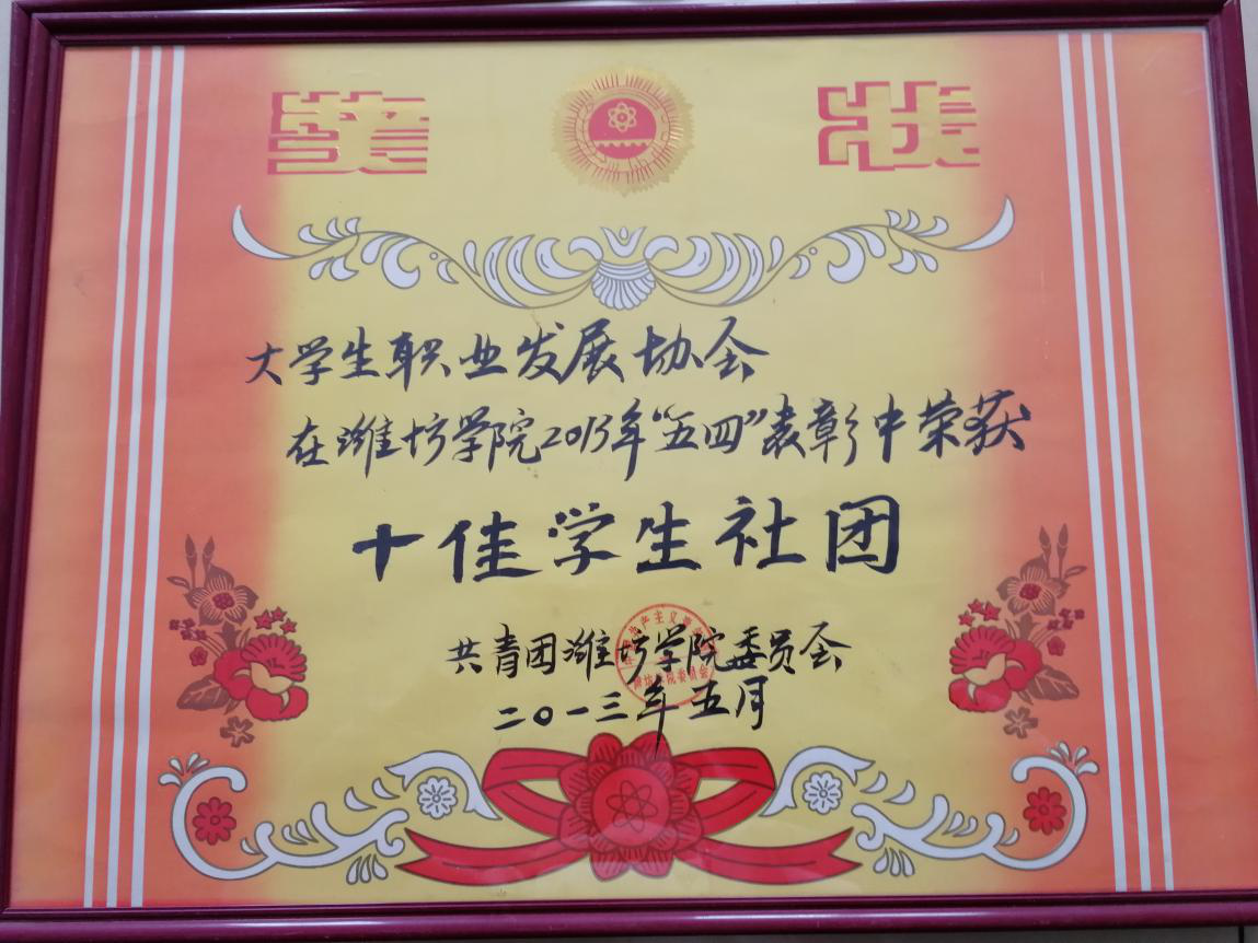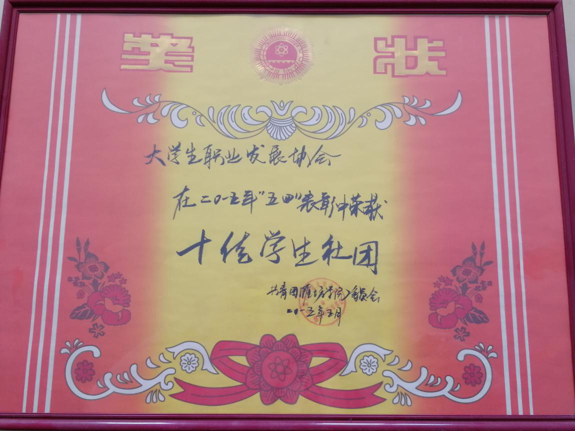 1、2013年五四表彰中荣获“十佳学生社团”。