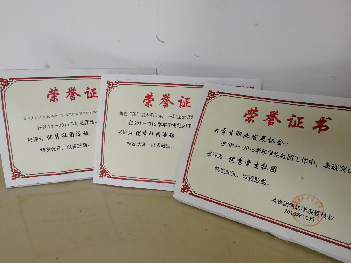 3、2014-2015、2015-2016学年中,大学生职业发展协会“勇往职前系列活动--职业生涯规划大赛”被评为优秀社团活动。