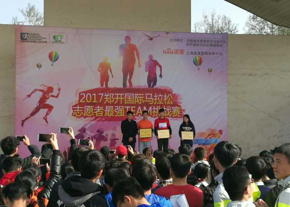 4.郑开马拉松志愿者:郑开国际马拉松是河南省唯一常设的大型国际体育赛事,我校志愿者主要负责车辆服务类志愿工作,及负责开赛前运动员包裹的存放和完赛后运动员包裹的取回,对运动员的包裹进行妥善的保管,使运动员能更好的投入到比赛中去,保证比赛更顺利地进行。