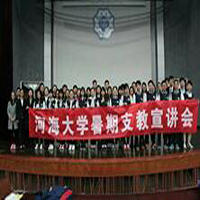 暑期支教:每年在校内招募一定数量的大学生志愿者,进行相关技能培训,利用暑假时间,前往全国各地的支教点开展为期半个月的支教活动。暑期支教是支河自成立以来每年规模最大的公益活动,随之社团的发展壮大,支河的暑期支教已经成为河海大学最具代表性的支教活动,并且支河在甘肃、四川、云南、江苏、山东、安徽、广西、陕西、桂州等地均建立了社会实践基地。迄今为止,我们累计筹集资金逾10万元,招募志愿者250多名,受益儿童数量超过3200人,而这一数据还在持续增长。